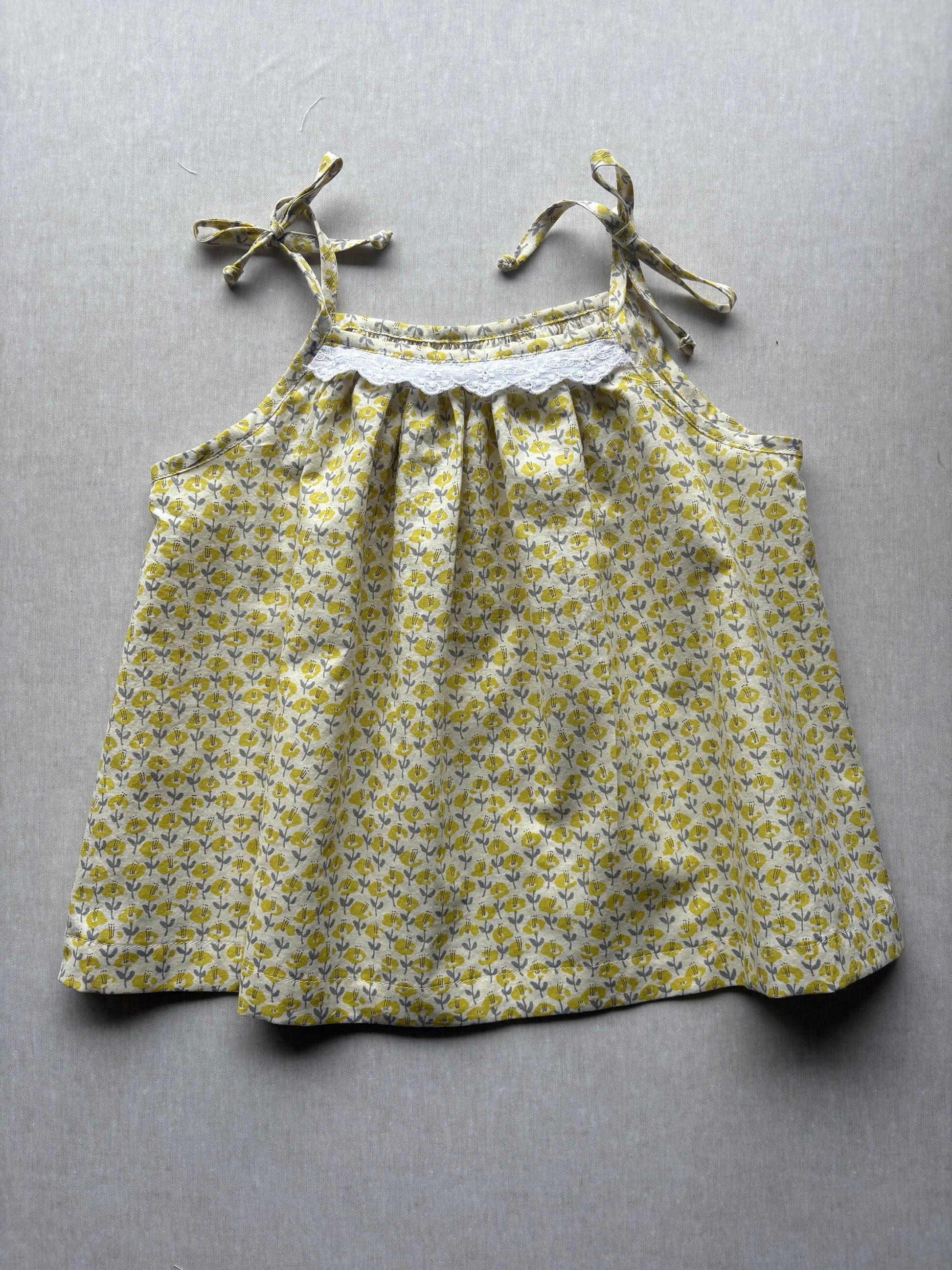 A very feminine sleeveless top with shoulder straps, gathers on the front and back.Lace on front.